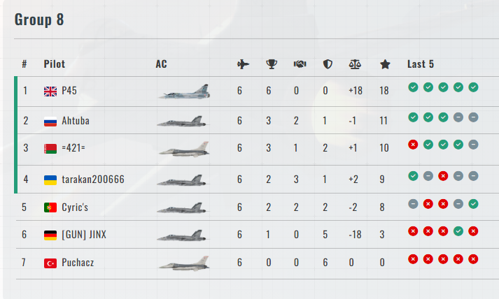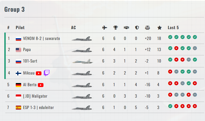 Groups 3 and 8 competed in the Group Stage of the VIRPIL Controls BFM Tournament! The pilots advancing to the Knockout Stage from each group are: